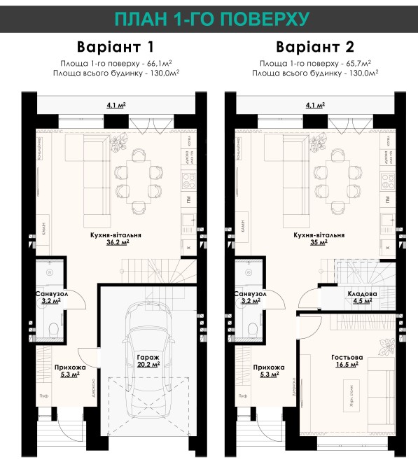 Можливо вибрати планування 1-го та 2-го поверхів на етапі будівництва.