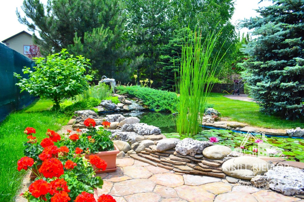 Отдельная зона отдыха на участке с декоративным прудом и экзотическими рыбками.