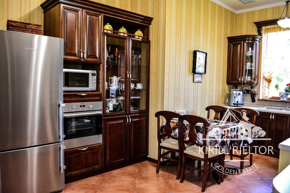 Удобная кухня с качественной техникой, выполненная в классическом стиле из натурального дерева.