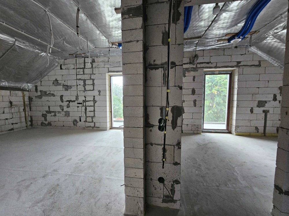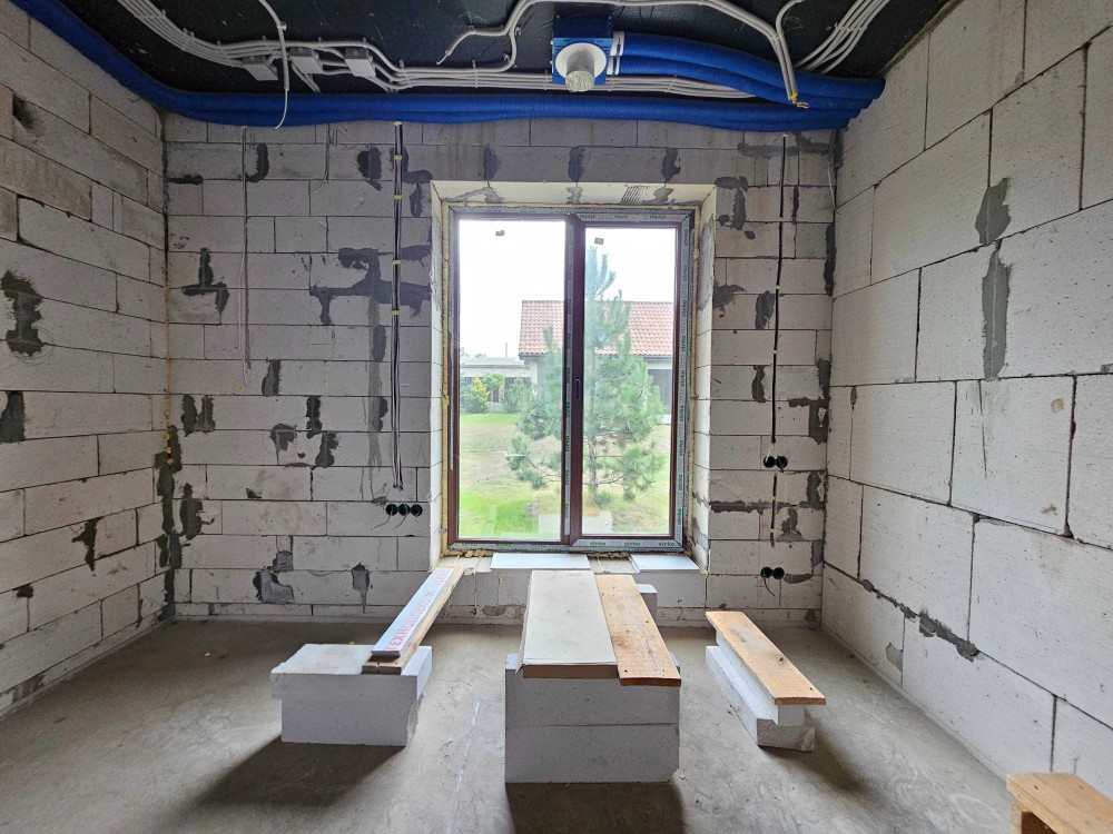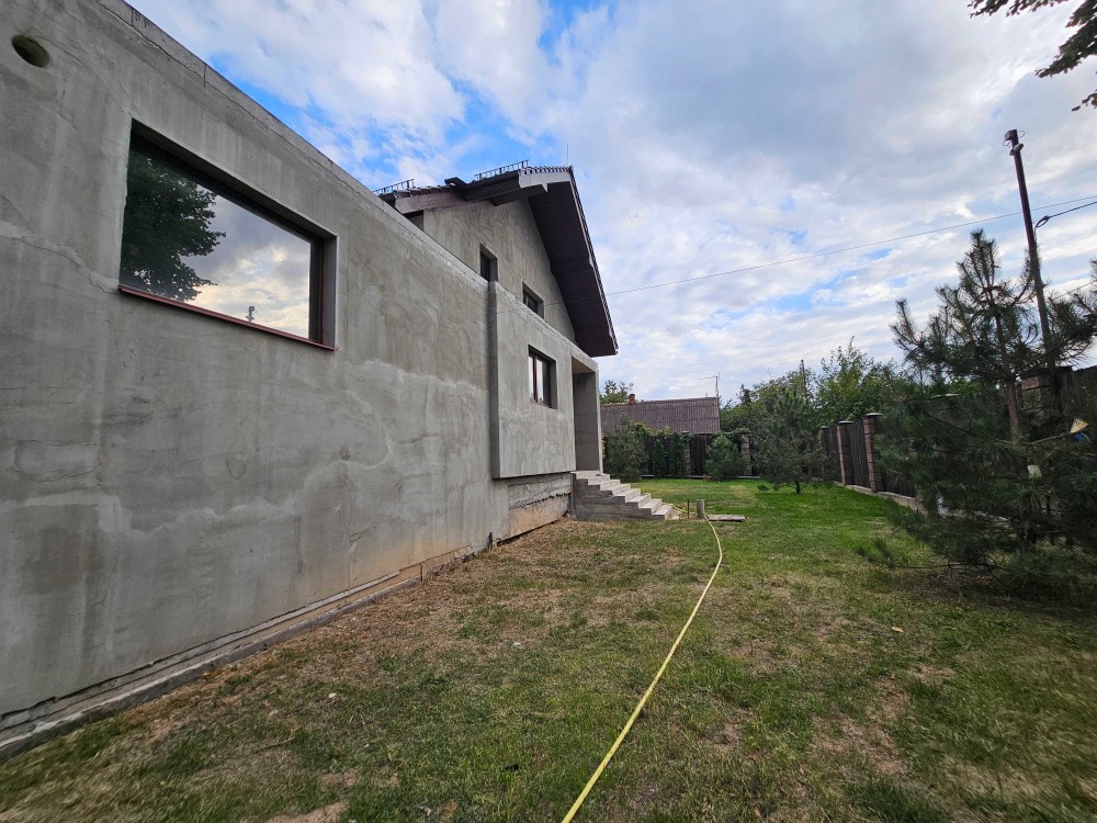 Дом построен на приватном участке площадью 10 соток. Стены из газобетона толщиной 500 мм. Крыша утеплена и покрыта керамической черепицей.