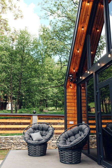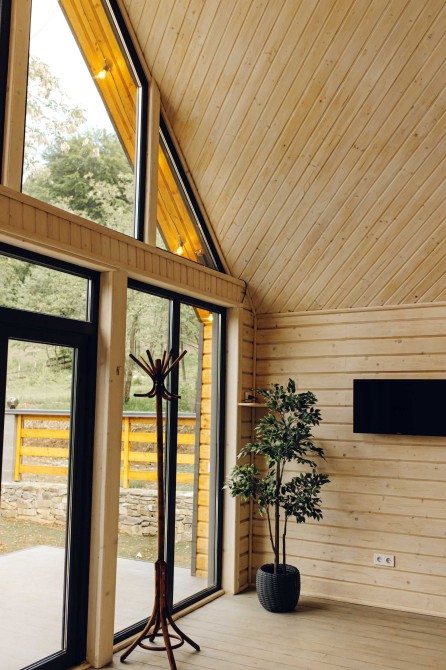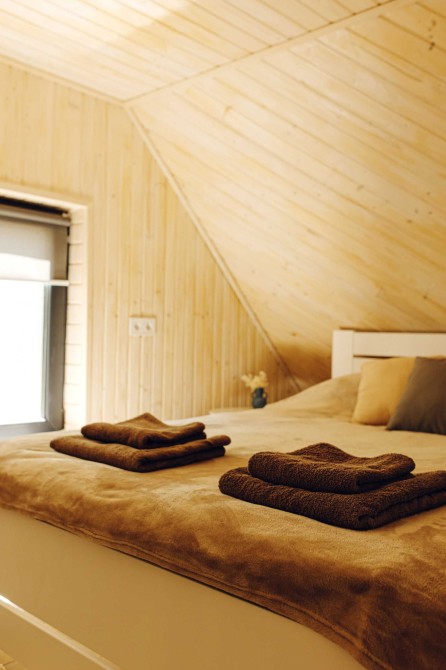 На зоні відпочинку зверху нічого зайвого- велике двоспальне ліжко і вікна, з яких відкривається вид на красу незайманої природи Карпат.