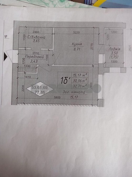 Загальна площа - 32,7кв.м,кухня - 8,71 кв.м