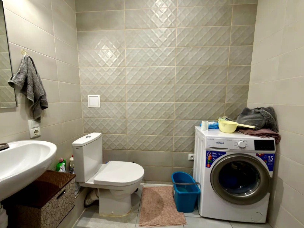 У санвузлі покладено сучасний кахель, установлена ванна, унітаз, рукомийник, пральна машина, дзеркало з підсвіткою.