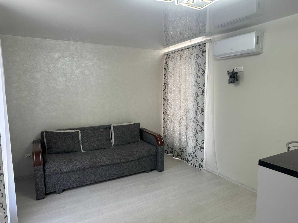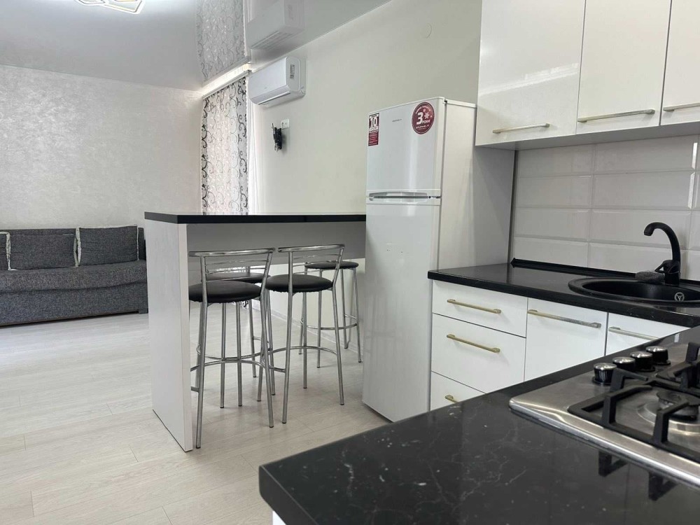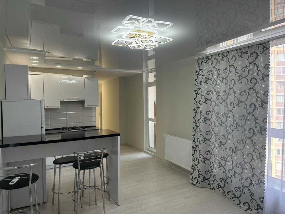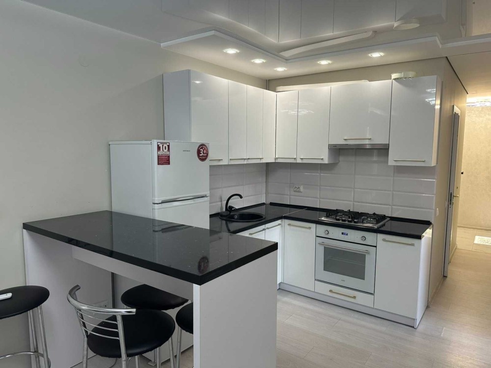 Квартира з ремонтом, меблями та технікою, планування: кухня-студія та окрема спальня.
