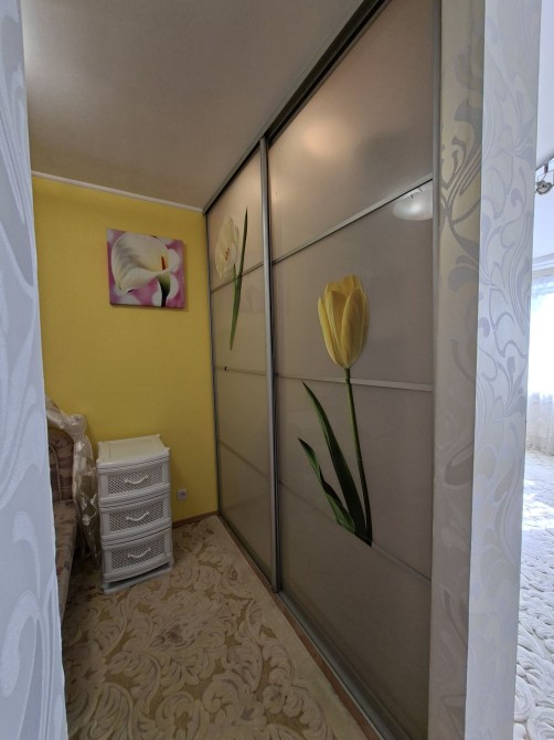 Кухня-вітальня з окремою спальною зоною яка зачиняється на двері. В спальні є гардеробна кімната.