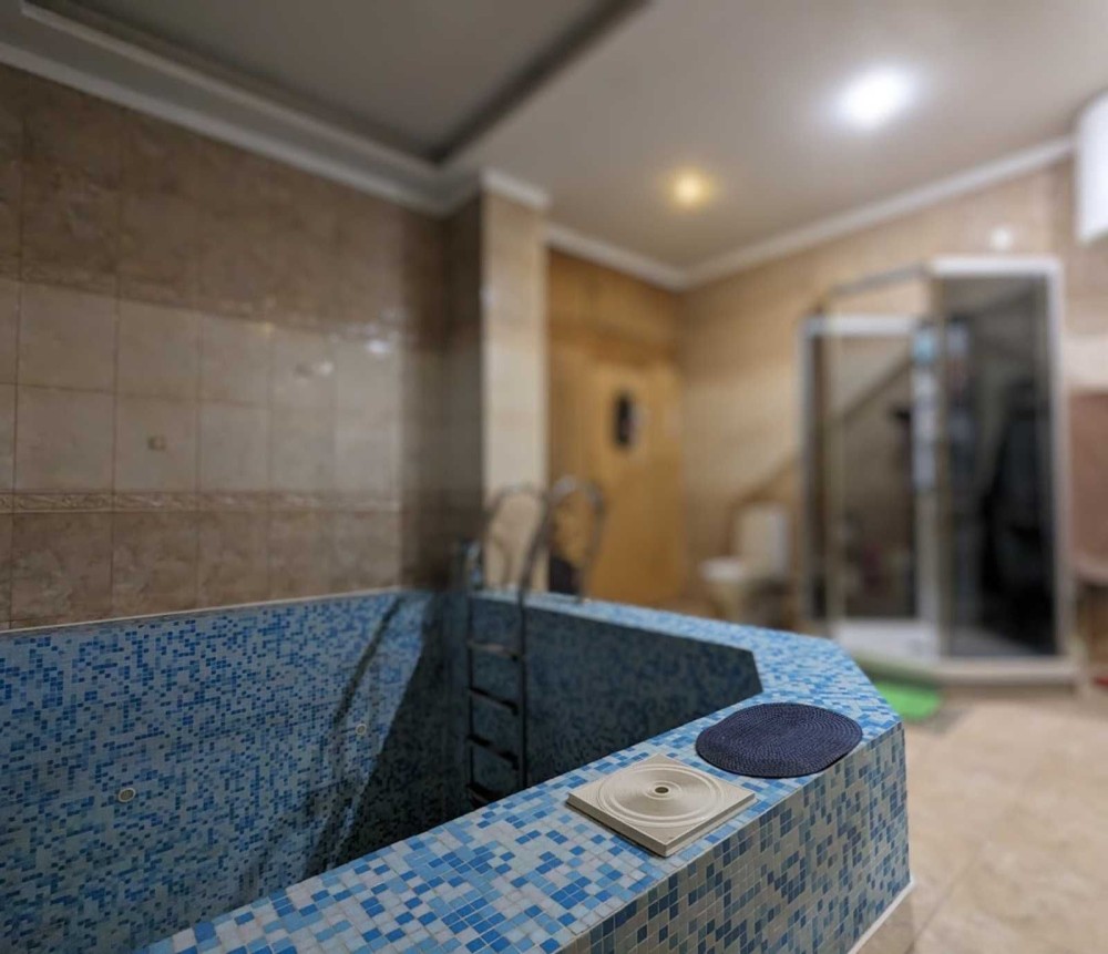 Ванная комната с бассейном и сауной, хорошо оборудованная кухня-студия, с выходом на летнюю террасу, откуда есть выход во внутренний двор с открытой зоной для отдыха, бассейном и красивым фонтаном. холл с выходом на балкон, гардеробная с окном, ванная комната, кладовая.