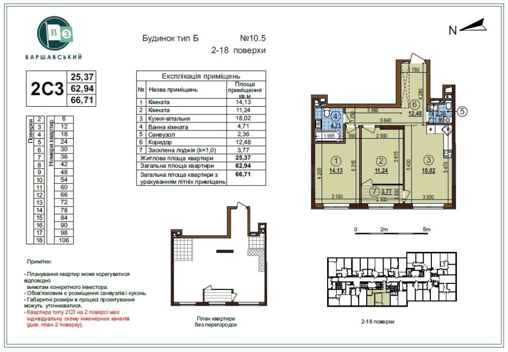 Площа 67/26/18м2. План 2С3. Поверх 15/18.