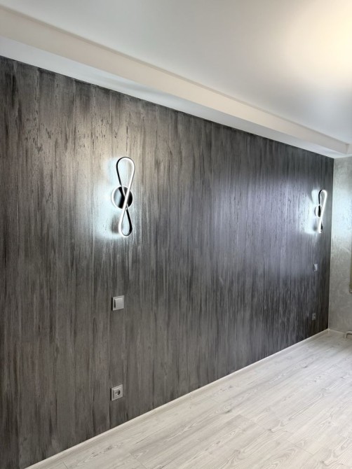 Интерьер продуман: хорошее освещение, декоративная штукатурка на стенах, акцентная стена с декоративным камнем — квартира выглядит современно и аккуратно.