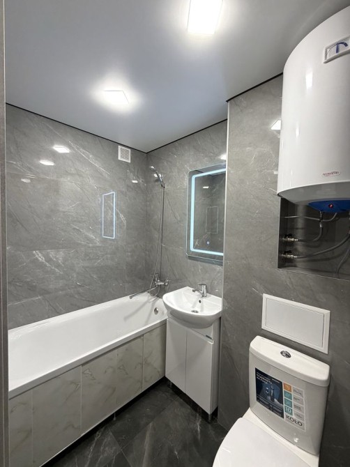 Выполнена стяжка, полы выровнены, по всей квартире уложен ламинат. Ванная с санузлом совмещённые: на полу кафель, на стенах керамогранит, установлен бойлер.