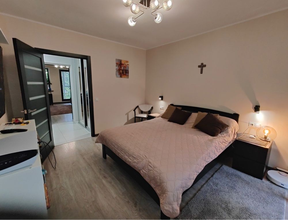 Выполнений капитальный ремонт, шумоизоляция ,теплый пол , энергосберегающие окна , дорогостоящая кухонная мебель , натуральный камень , мебель и двери -натуральное дерево