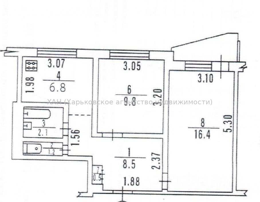 • Площа кухні 6.8 м2