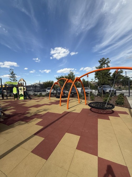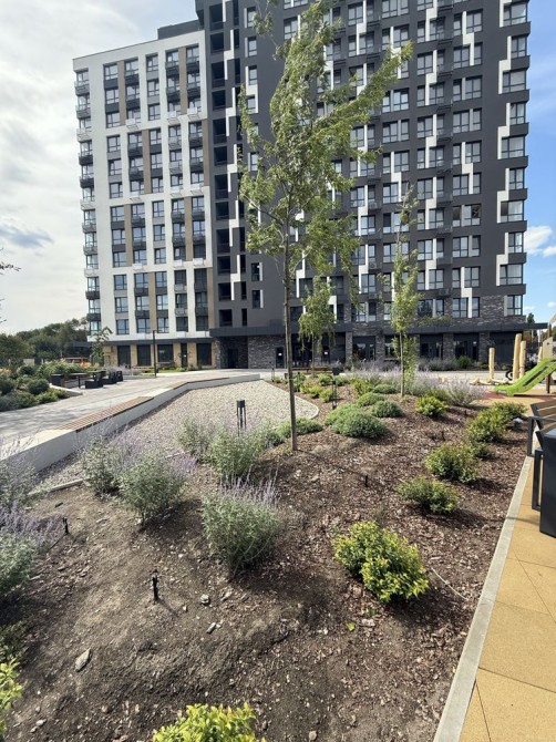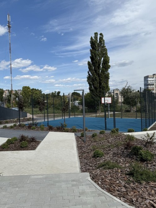 Затишна закрита територія з дитячим і баскетбольним майданчиком.