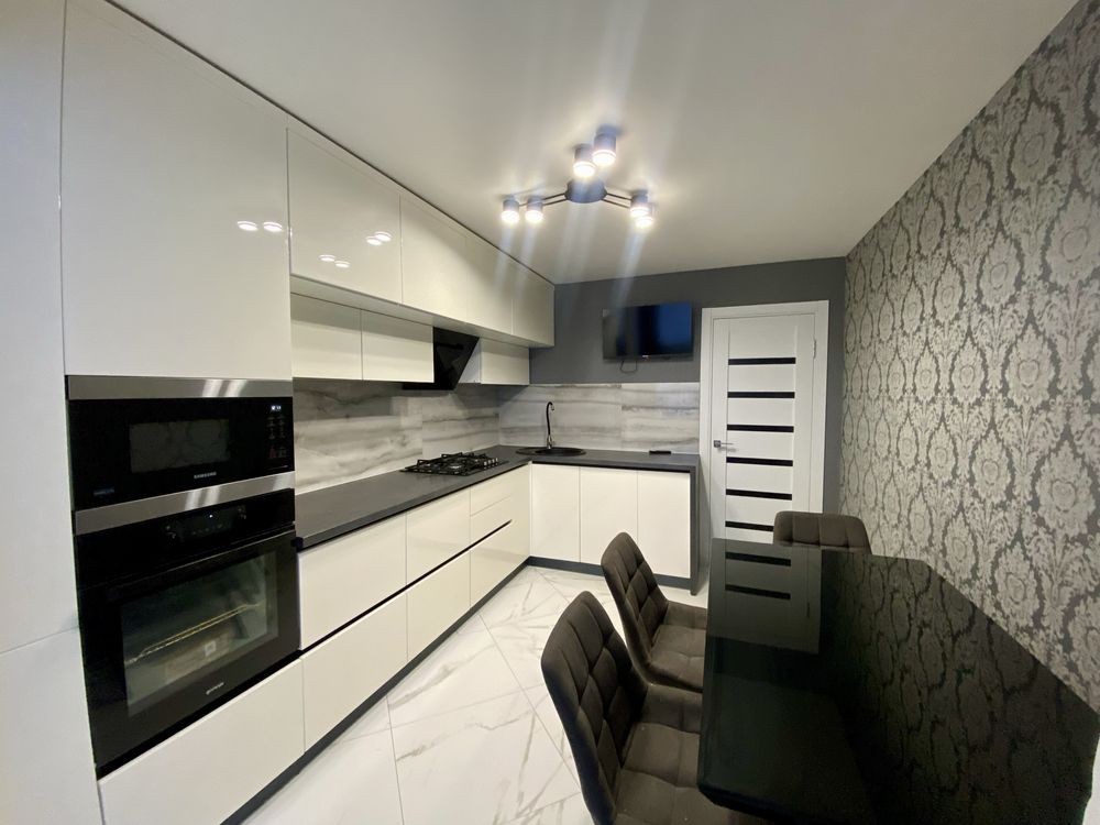 Кухня виконана у мінімалістичному стилі з глянцевими фасадами, вбудованою технікою та продуманою системою зберігання.