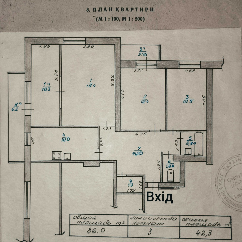 загальна площа - 86 кв.м., житлова - 42,3 кв.м.