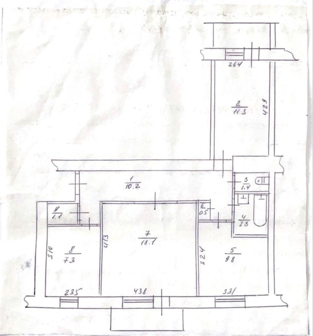 кухня 10 кв.м, 3 окремі кімнати, 1 роздільний санвузол, передпокій.
