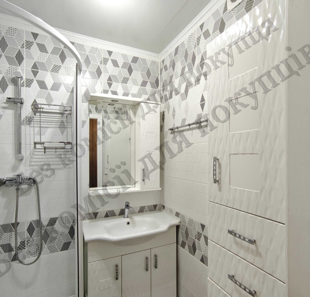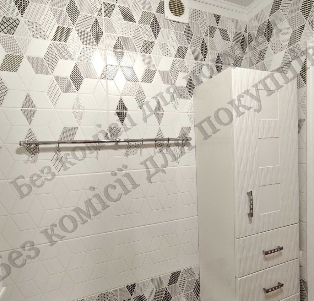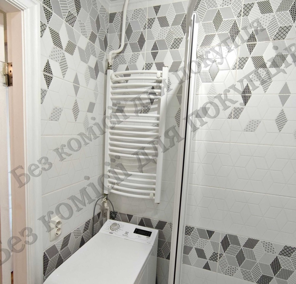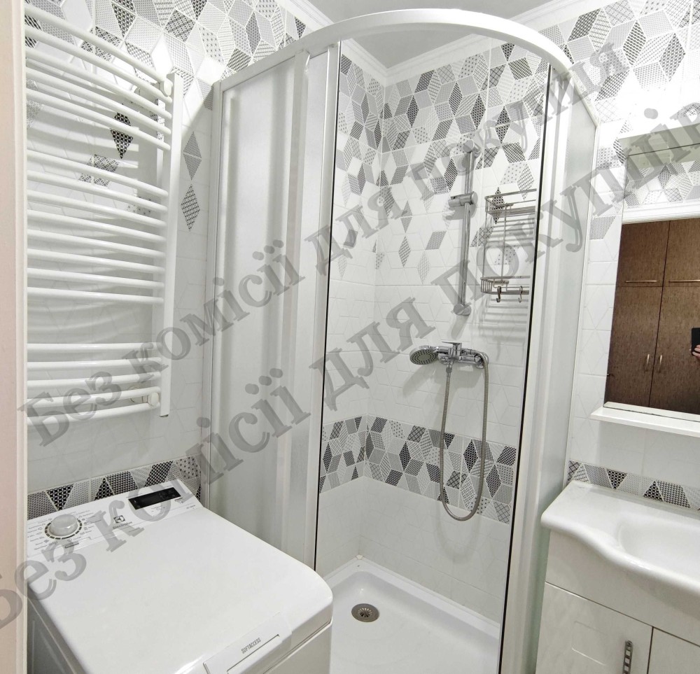 Санвузол роздільний. Кахель. Душова кабіна, меблі у ванній кімнаті, рушникосушка.
