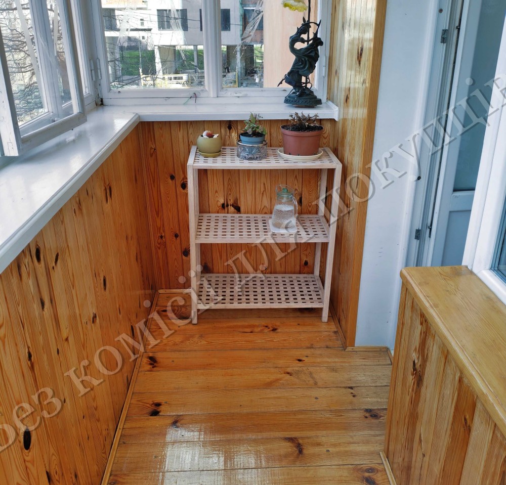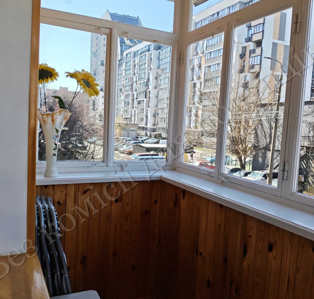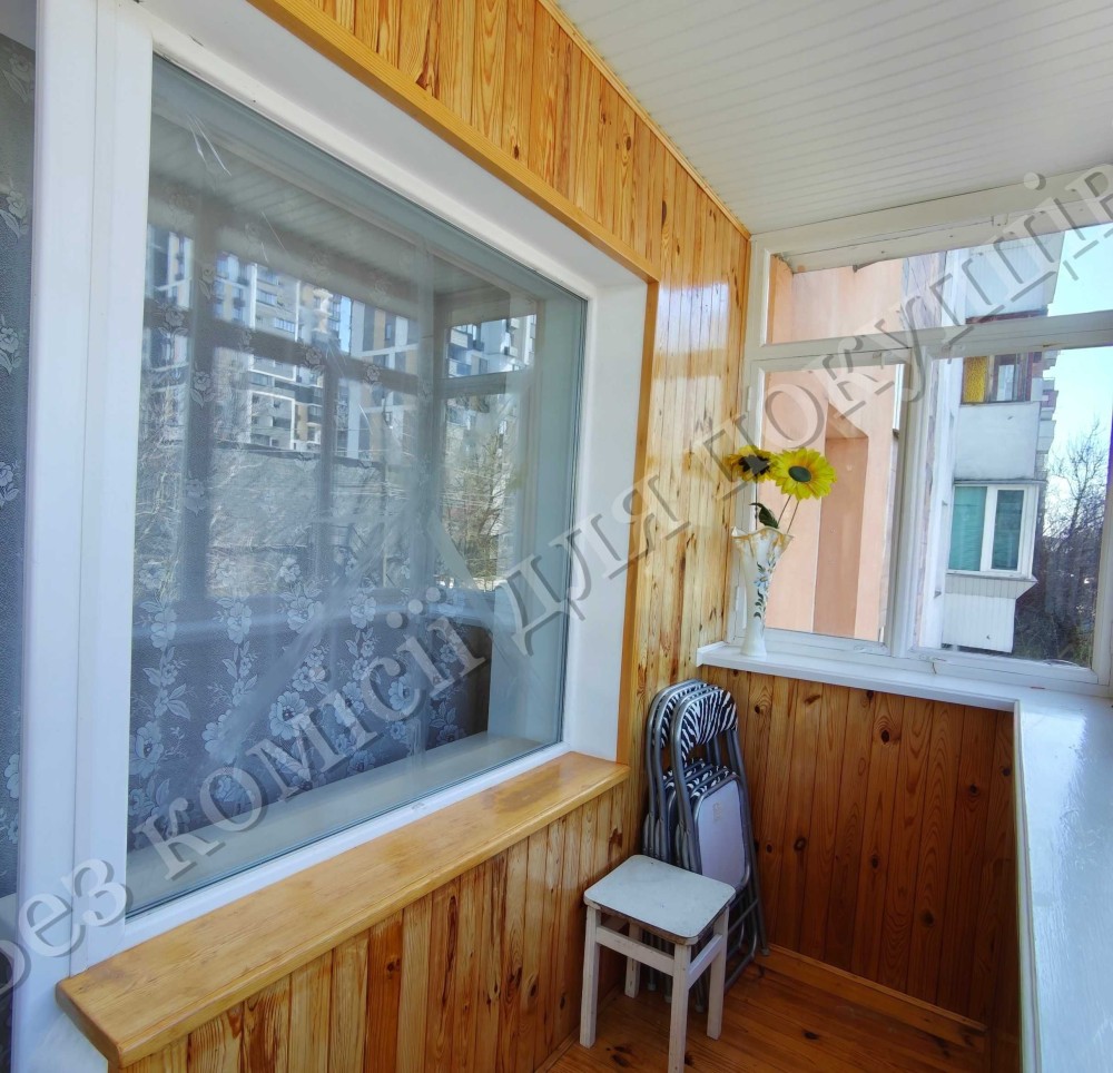 Балкон засклений у гарному стані, обшитий дерев’яною вагонкою. Лоджія на дві кімнати 7,5 м2, обшита дерев’яною вагонкою, в наявності зручні шафи.