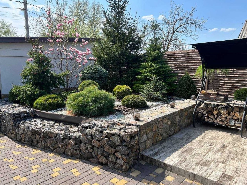На участке шикарный ландшафтный дизайн, высажены редкие экзотические растения, газон, все хвойное, так что листья убирать не нужно. Абсолютно под каждым растением автоматический полив. Также на всем участке сделана система отвода воды, в дождь вода не стоит, участок был поднят и сделан с уклоном, проложены трубы.