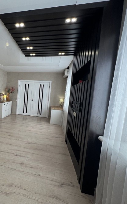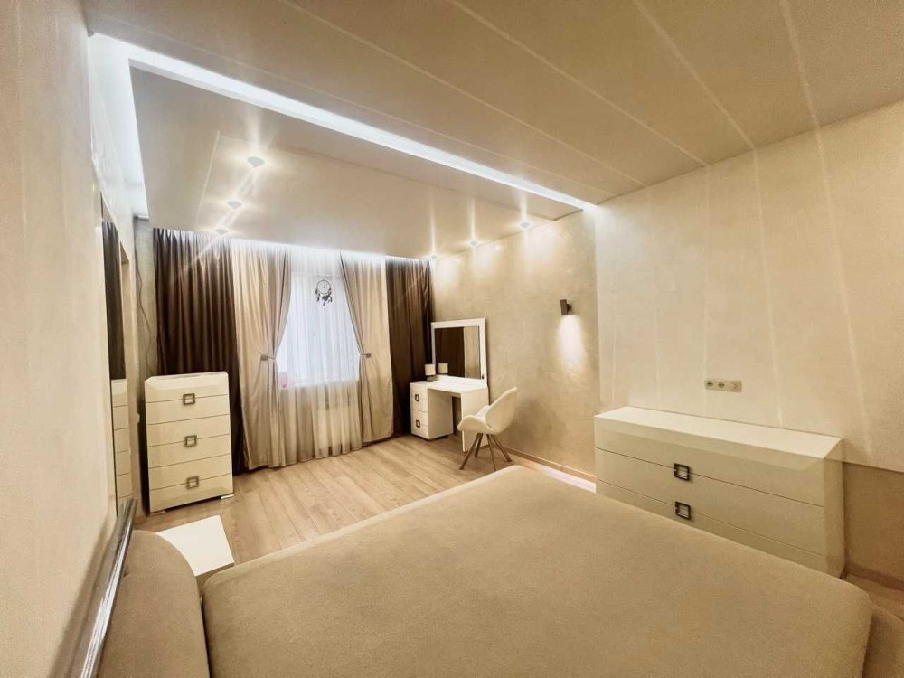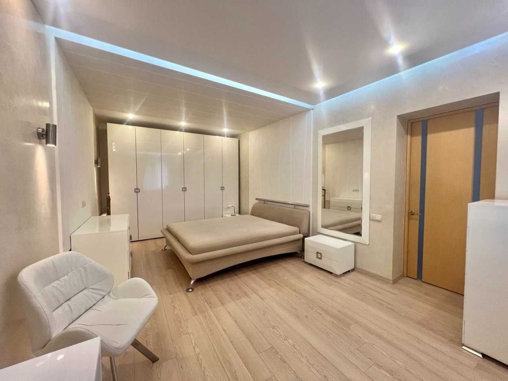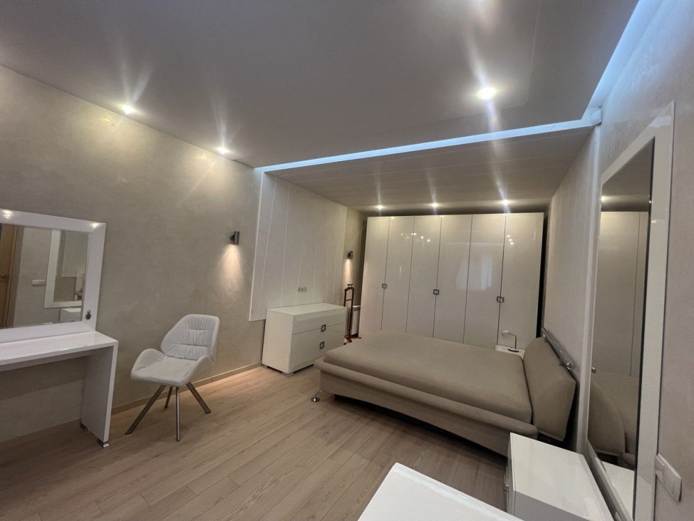 - Спальня батьків 27м2: 6,5×3,5 м з натяжною стелею та LED-підсвічуванням