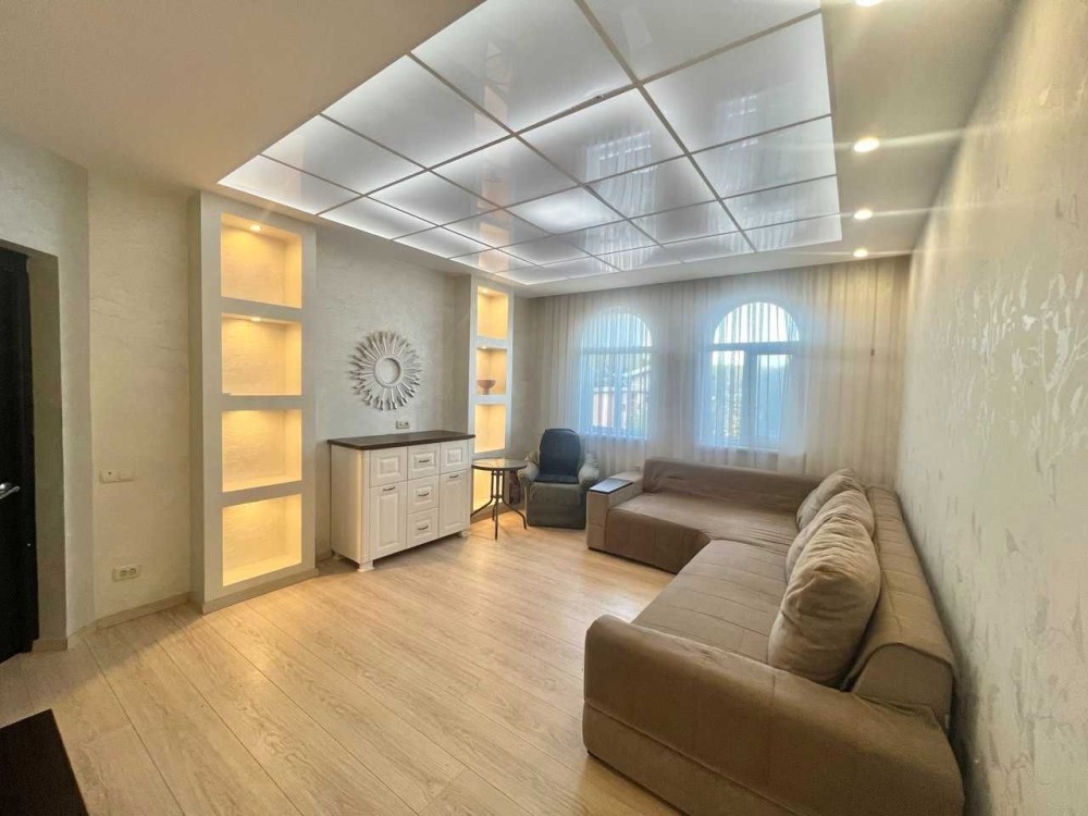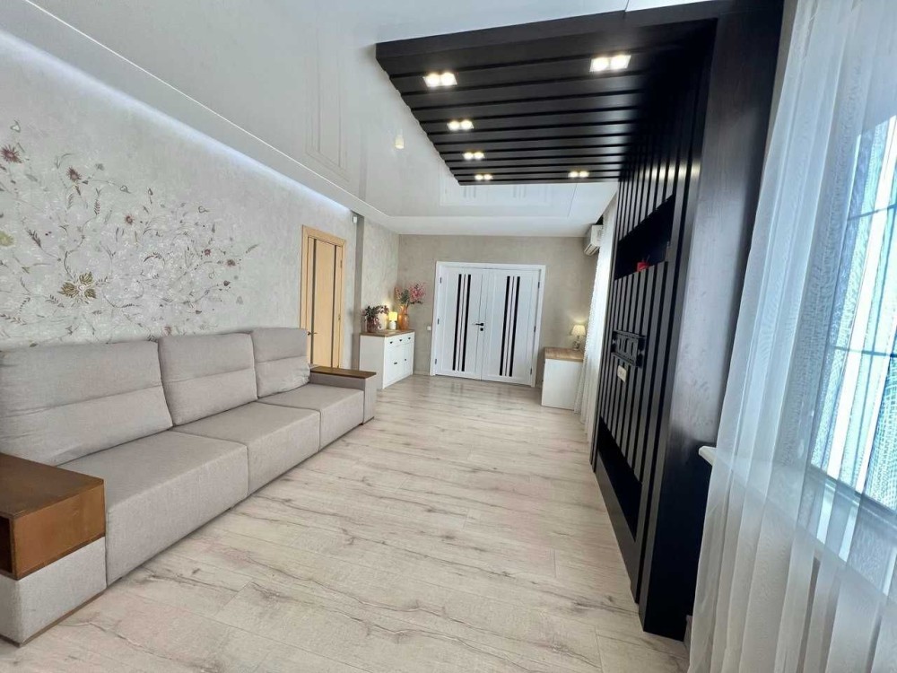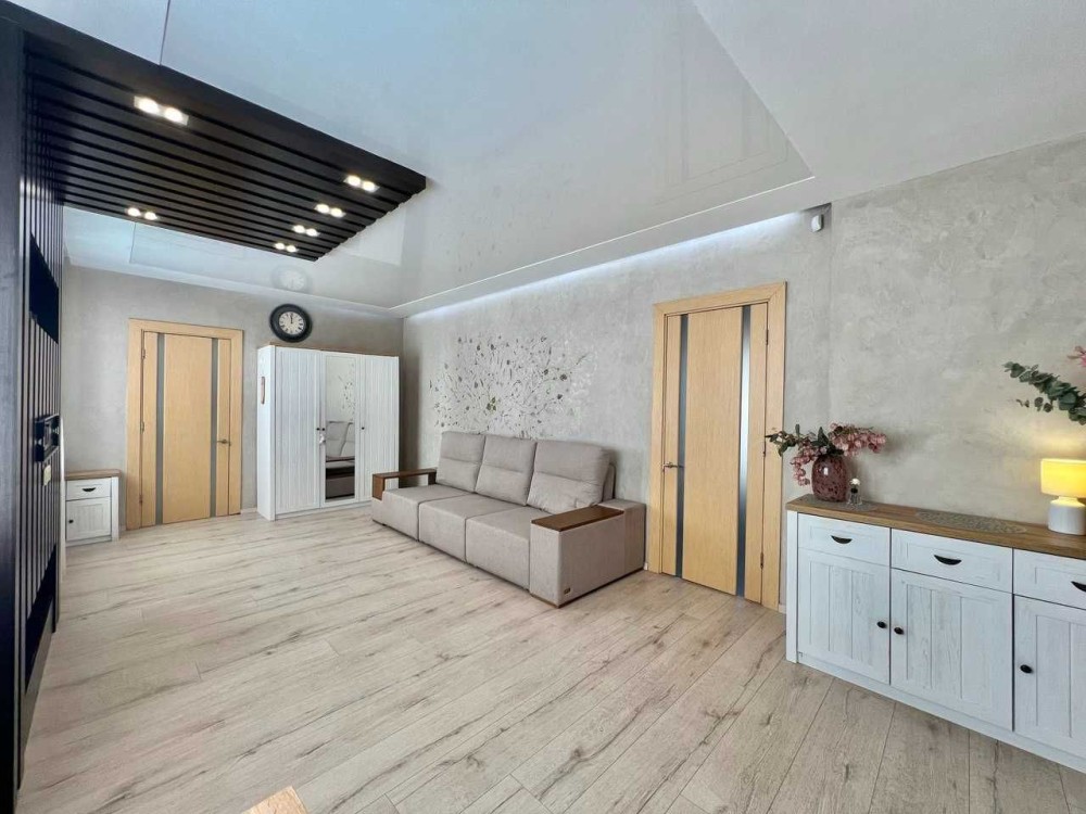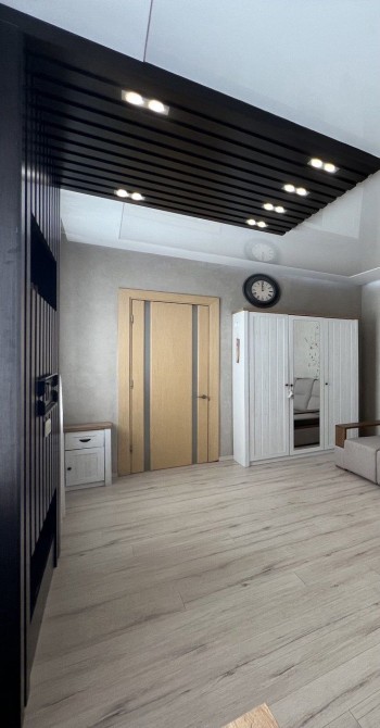 - Зал 28 м² з натяжною стелею, декоративною штукатуркою, LED-підсвічуванням