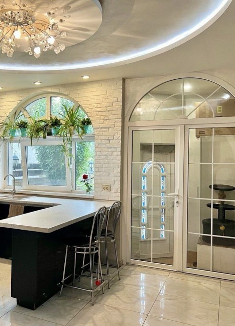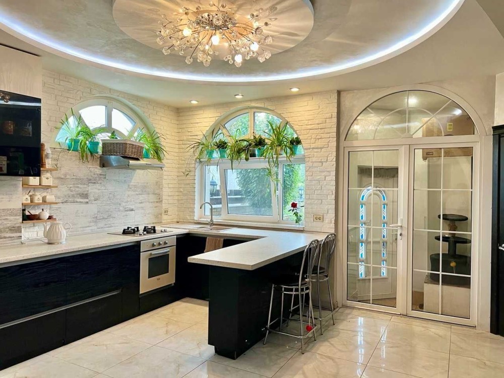 - Кухня 30м² з теплою підлогою, кахель 60×60 під мармур, вбудовані меблі, дизайнерська стеля у вигляді серцеподібної квітки, символ «два сонця»