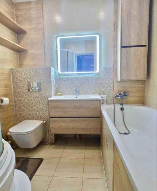 - Основний санвузол: облицювання з білої глини (Іспанія), якісна сантехніка
