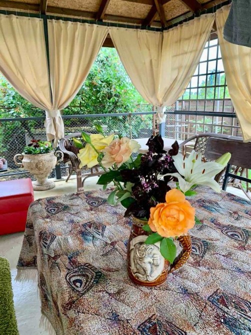 -Літня кухня під загальним черепичним дахом з лазнею, обладнана мийкою, газовою плитою та балоном