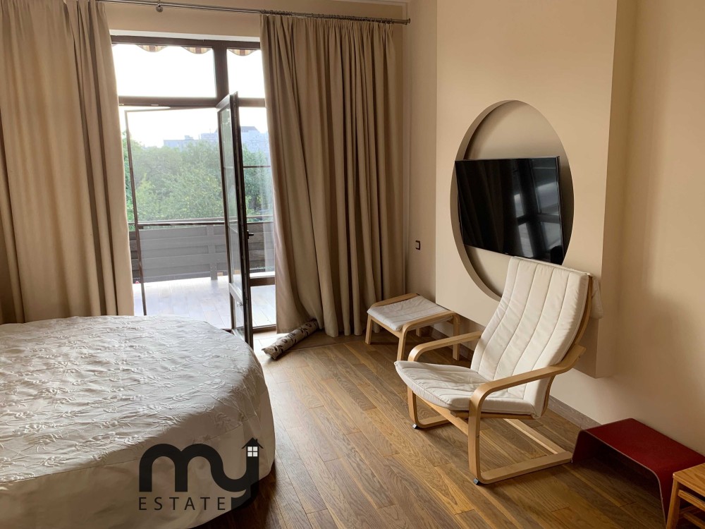 - Три спальні на другому поверсі (головна спальня і 2 дитячі) – всі мають великі панорамні вікна, є вихід на великий відкритий балкон-терасу з лежаком. Головна спальня (25 м. кв) має велике кругле ліжко (220 см у діаметрі), шафу-гардероб, власний санвузол, телевізор. Дві дитячі обладнані потрібними меблями, зокрема столами і шафами. В усіх спальнях є кондиціонери.