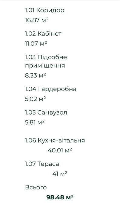 Перший поверх: кухня-вітальня, кабінет, кладова, гардеробна кімната, санвузол, тераса