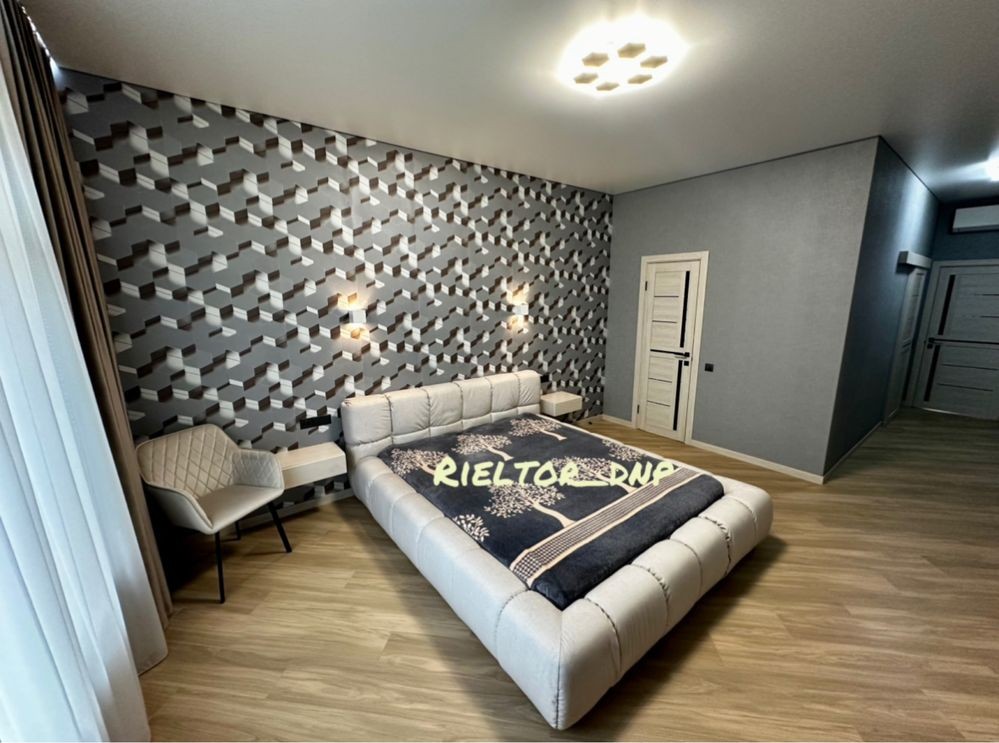 4 отдельных спальни, гардеробная, 2 с/у, большая кухня студию, гостинная, топочная, кладовка, терраса 25м.