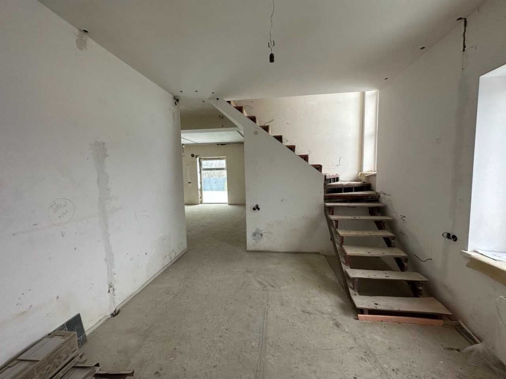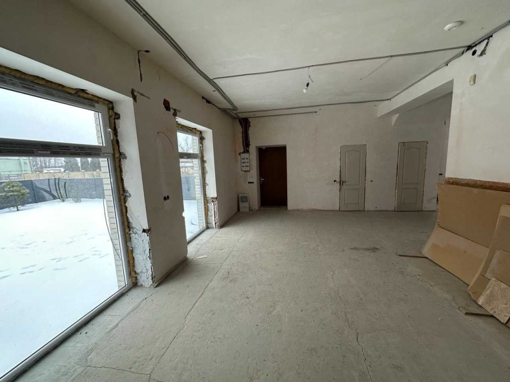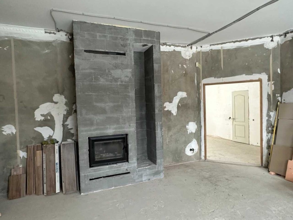 площа 97,4м2має два основних приміщення,велику кухню-студія з вікнами до підлоги,прихожа,та велика кімната для гостей з вбудованим дровяним каміном Kratki ZOSIA . Тепла підлога всього першого поверху, санвузол.Купленна плитка на всю підлогу першого пверху,плитка білиа під мрамур Іспанія. Стіни поштукатурені та по шпакльовані під любе фінішне оздоблення.Стеля ГКЛ+шпаклювання під фініш.