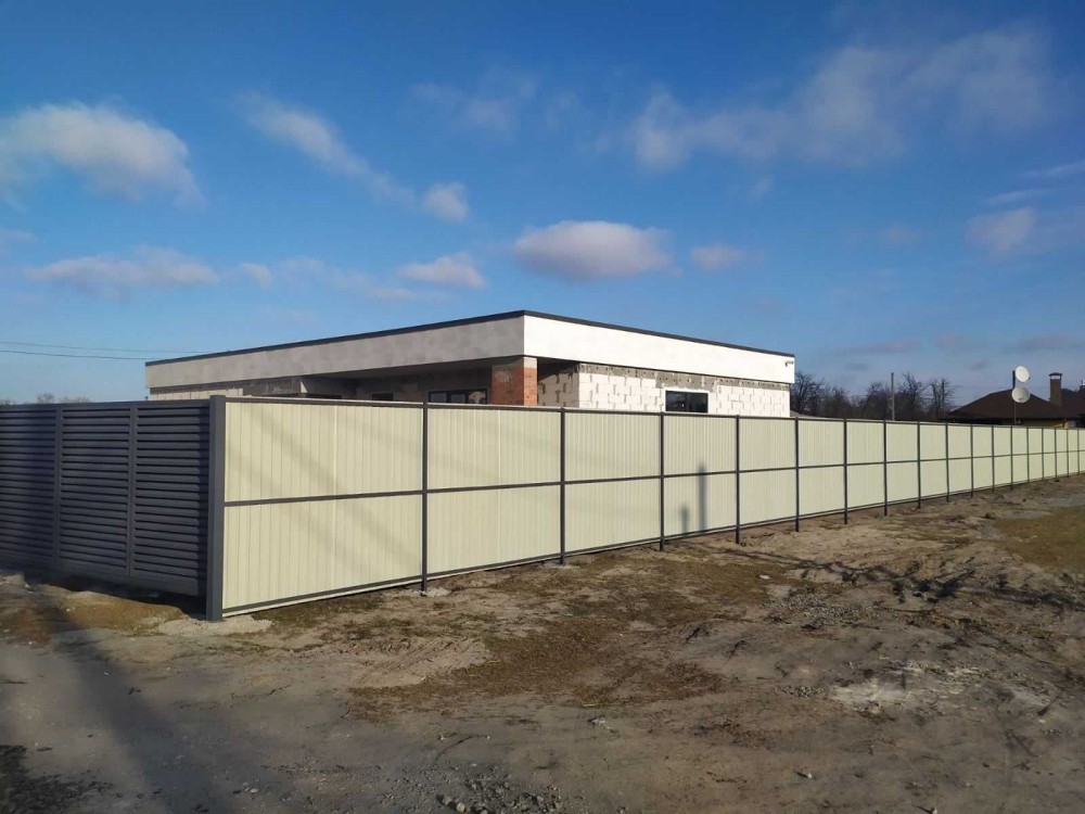 Двор огорожен с внутренних сторон еврозабором с фасадной части вентелируемым металлопрофилем.Установлены откатные ворота и калитка .