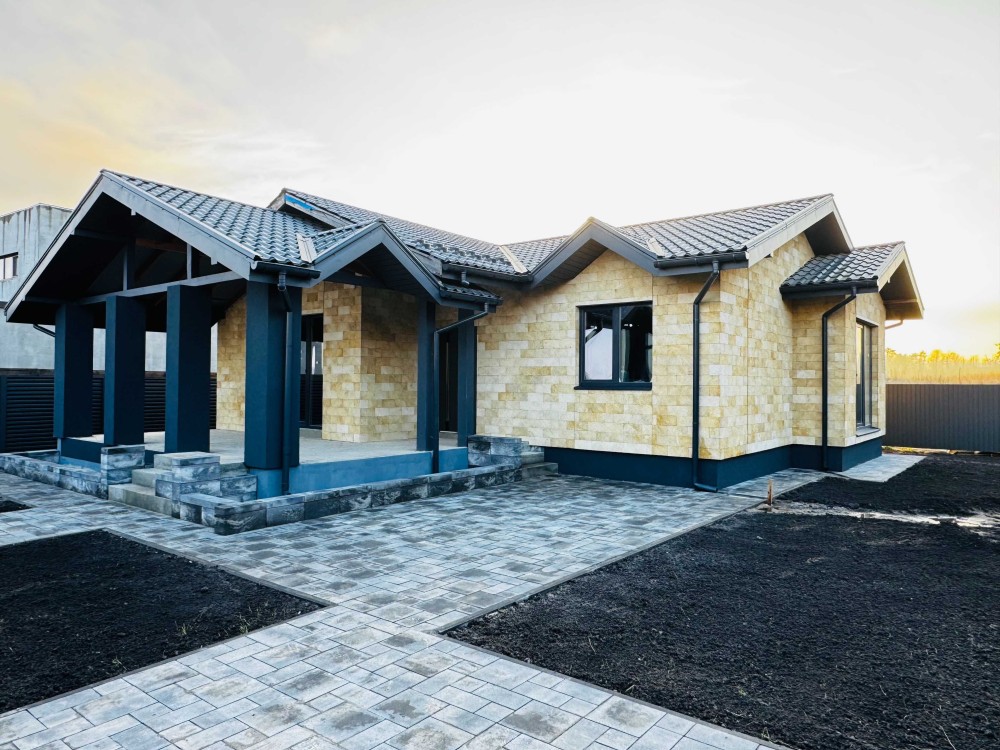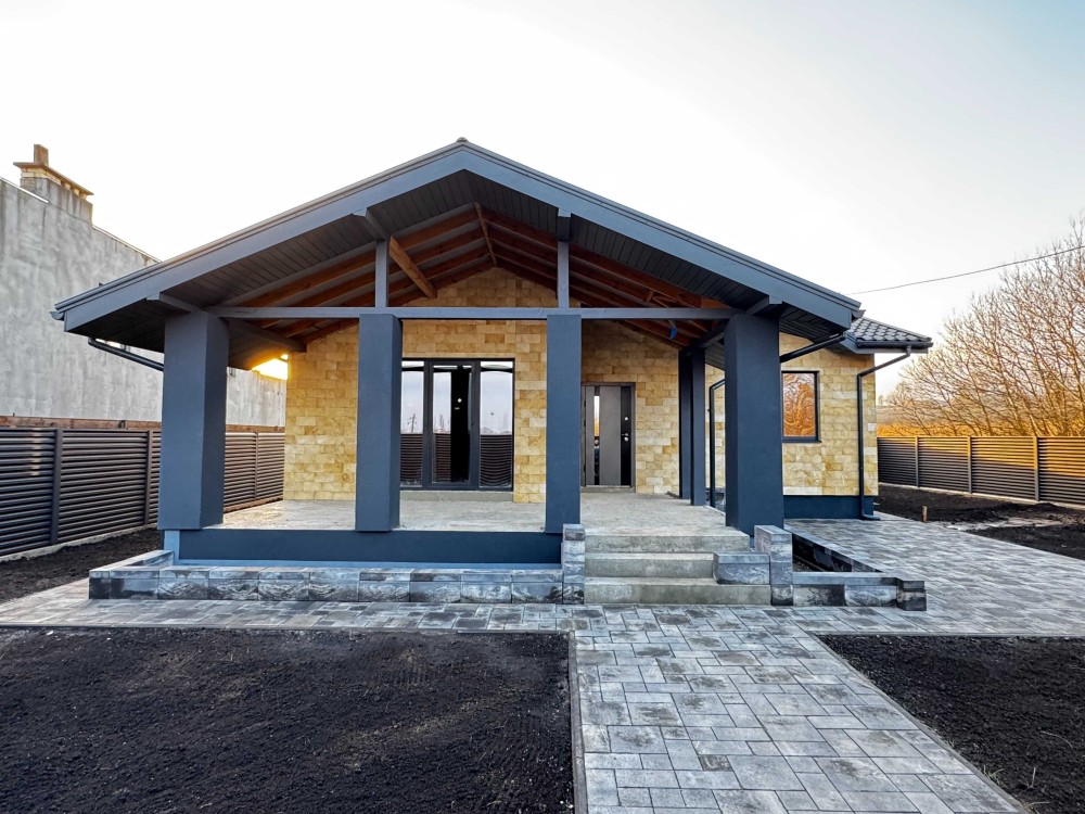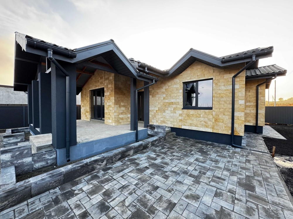 Стіни – керамоблок, утеплення – пінополістерол, дах – металочерепиця, зовнішнє оздоблення – облицювальний камінь,