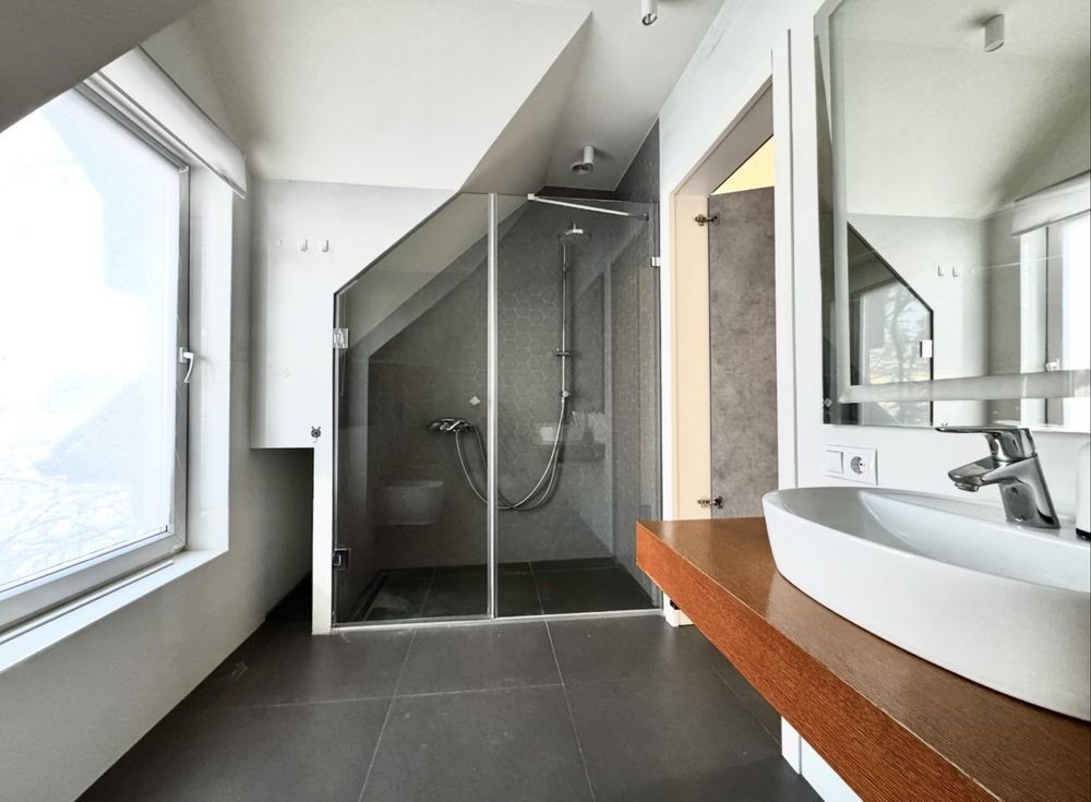 Продам новий будинок 2022 року на Нижньому ДНСі. Два поверхи плюс підвал і холодне горище. Газоблок Д-400 вкритий металочерепицею, обштукатурений і пофарбований, перекритий монолітним залізобетоном. Площа будинку 104 метри. Перший поверх: велика кухня 30 кв.м. з панорамним склінням і виходом на задній двір, передпокій, коридор, перший санвузол. Другий поверх: три житлові кімнати, другий санвузол, сходовий марш. У підвалі котельна, на горище розкладна драбина. Заведена вода зі свердловини 85 метрів, водовідведення в центральну каналізацію. Електроенергія 20 КВт. Змонтована система водяних теплих підлог і радіаторів, електричний котел на 10 КВт. По усьому будинку виконана розводка електрики. Стіни перетерті, металопластикові вікна з теплими скосами, в обох санвузлах розведена і змонтована сантехніка, укладений кахель, душова кабіна на першому і ванна на другому поверсі. На першому поверсі поли викладено плиткою, на другий закуплено і залишиться ламінат, також закуплені і залишаться вуличні світильники та деякі інші матеріали. Залізобетонні сходи на другий поверх викладені керамогранітом. Ділянка 2.5 сотки, обгороджена, відкатні автоматичні ворота. Двір вимощений тротуарною плиткою, змонтовано відведення стічних вод в дренажний колодязь. Залитий фундамент і колони під бесідку і барбекю. З вікон і бесідки відкривається чудовий панорамний краєвид на зелену зону річки Рось. Ціна: 160.000 у.о. Торг. Запрошуємо до співпраці продавців і орендодавців нерухомості. Агенція нерухомості пропонує повний перелік операцій з нерухомістю та супровідною документацією. Купівля-продаж, оренда, обмін житлових та комерційних об’єктів, земельних ділянок. Оцінка майна ринкова та для оподаткування. Технічні паспорти. Узаконення самочинного будівництва, добудови, перепланування. Початок будівництва та ввід в експлуатацію. Землевпорядні роботи: кадастровий номер, приватизація, розподіл, об’єднання, зміна призначення. Кредитування під заставу нерухомості. Безкоштовно приймаємо заявки від продавців та орендодавців. Гарантія конфіденційності. Юридичний супровід. м.Біла Церква Тел.(097)-879-80-99