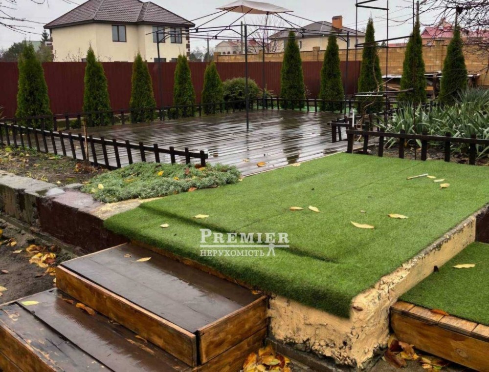 Розташован на ділянці 10 соток правильної форми, на території є літня кухня, сарай, гараж, альтанка, критий та літній майданчик.