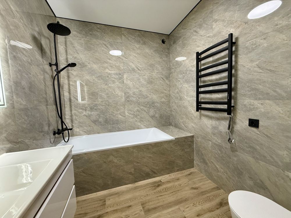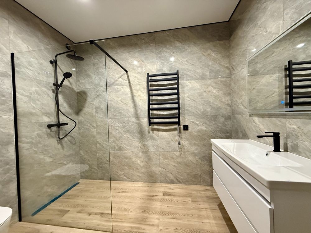Тепла підлога по всьому будинку, оздоблена керамогранітною плиткою.