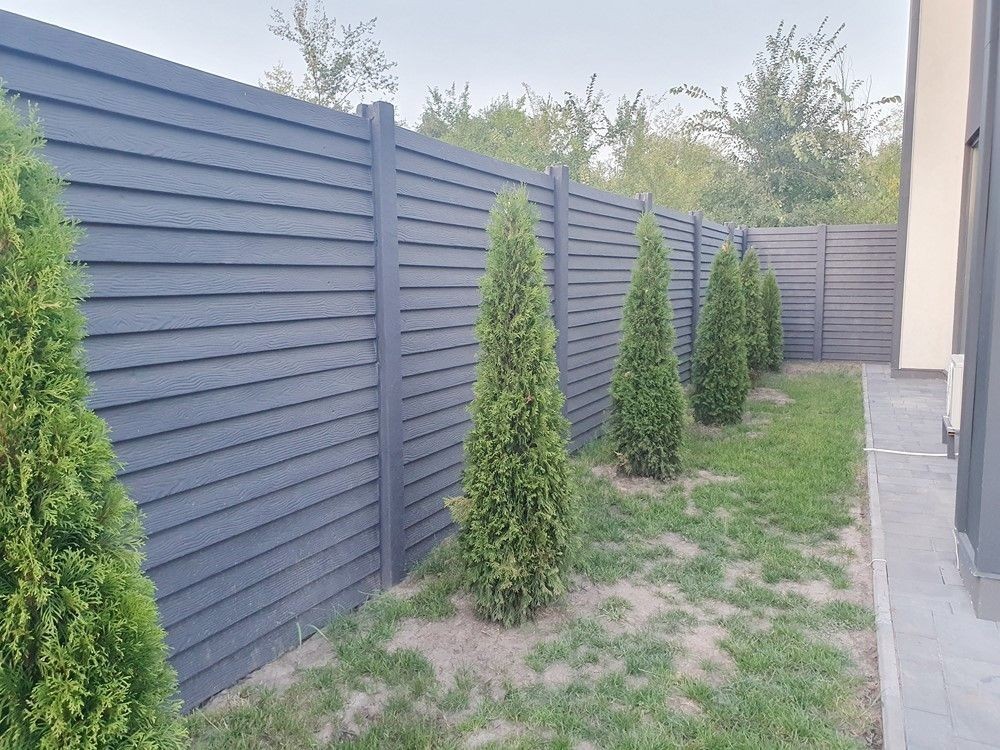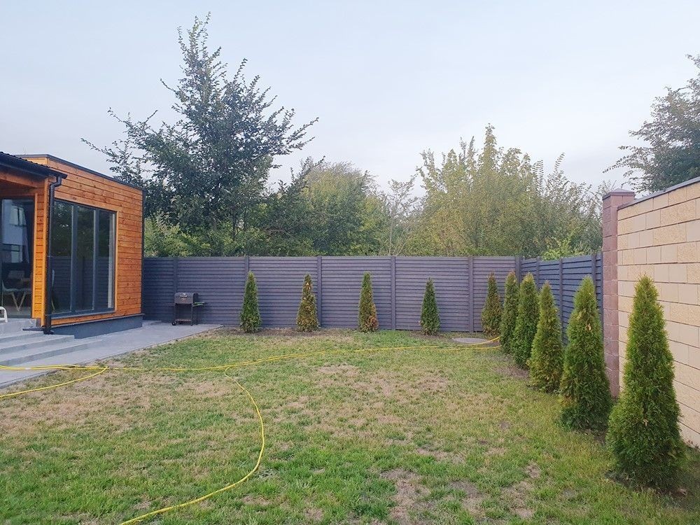 Огорожен забором, автоматические ворота, газон, тротуарная плитка, молодое озеленение,