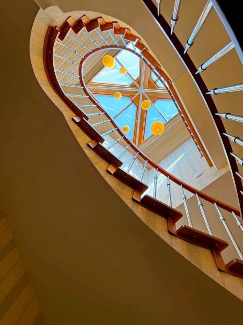 На втором этаже — гостиная с натуральным камином, облицованным ониксом, и выходом на балкон. Огонь в камине создаёт дому атмосферу тепла и уюта, особенно в холодные вечера.