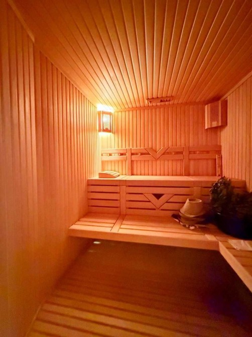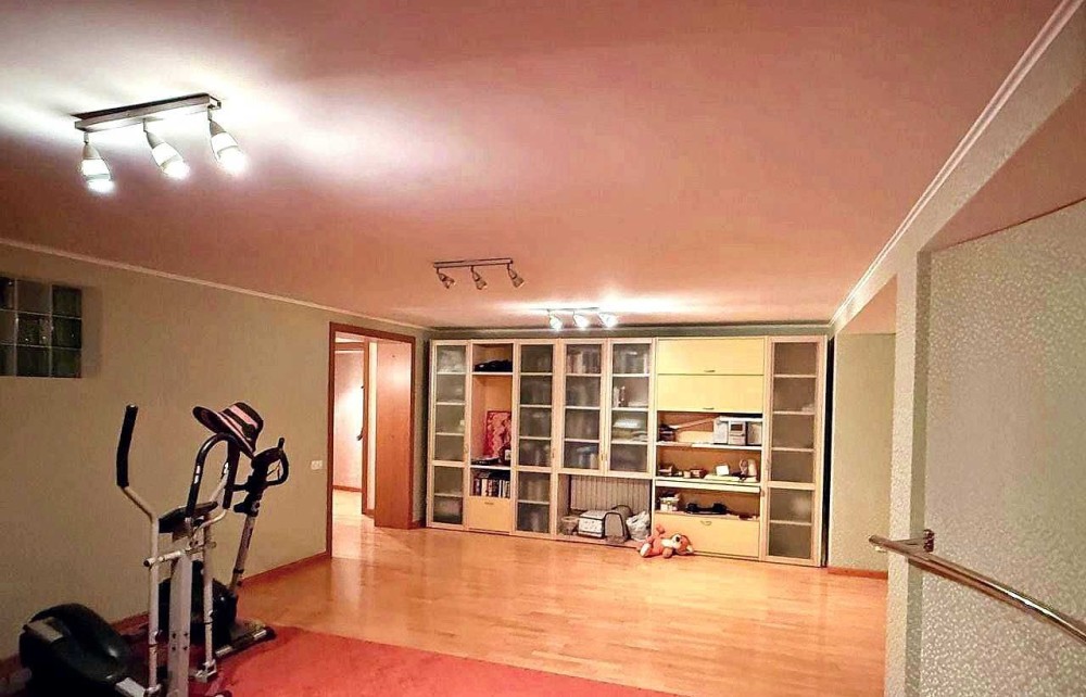 Внизу, в цокольной части, — сауна с душем, спортзал с тренажёрами и отдельные помещения для хранения.