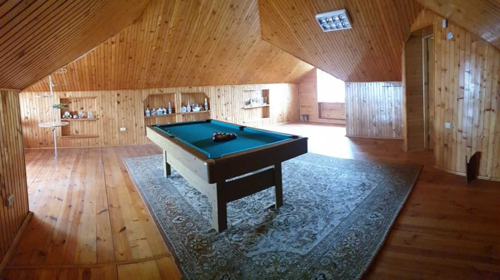 В доме расположены: 6 спален общей площадью 130 кв. м., туалеты и ванные комнаты на двух этажах, бильярдная комната, большая кухня.