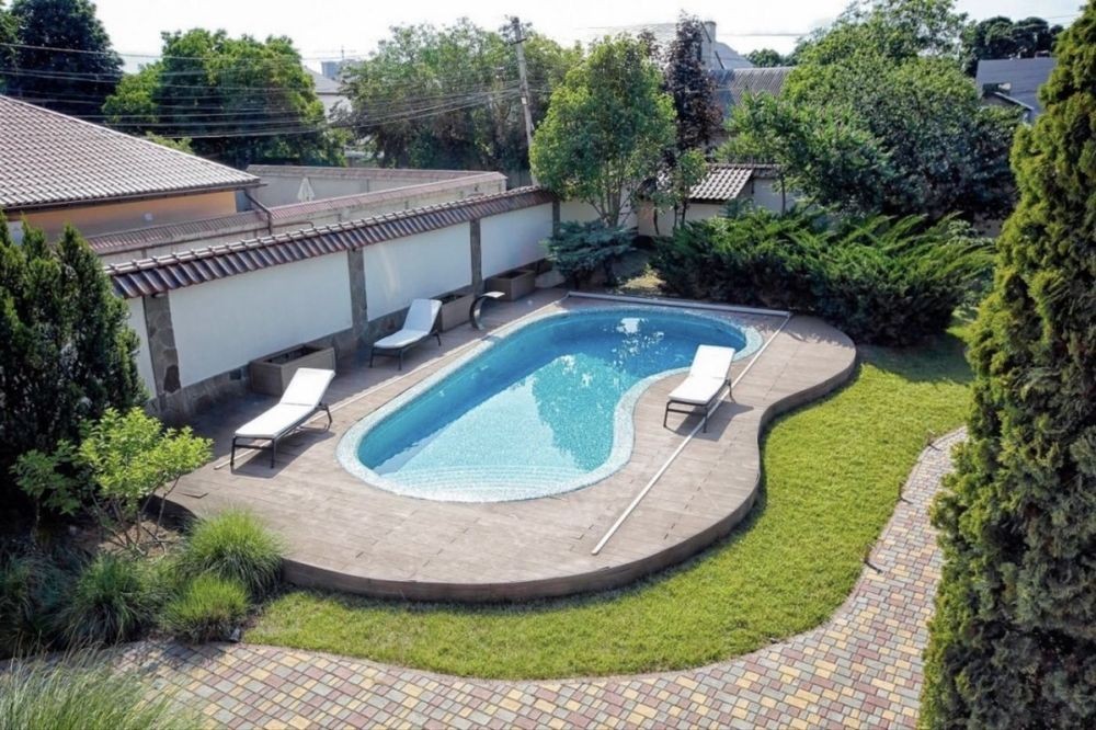 Участок радует глаз и душу: ландшафтный дизайн, бассейн, зоны для отдыха и семейных вечеров на воздухе.