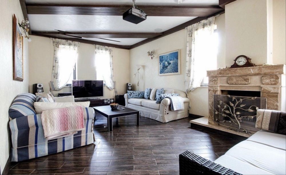 большая гостиная с камином и кухня-столовая с выходом на террасу и зону барбекю.