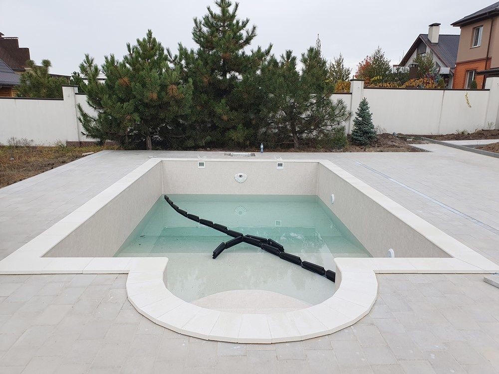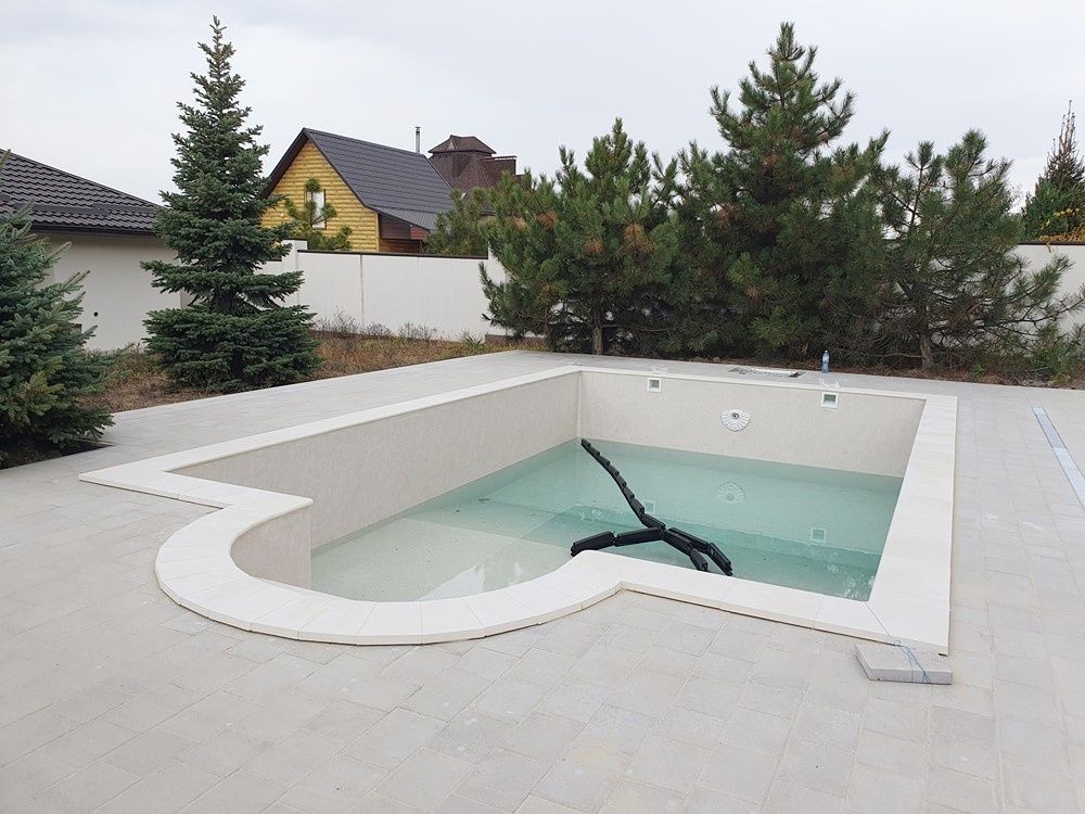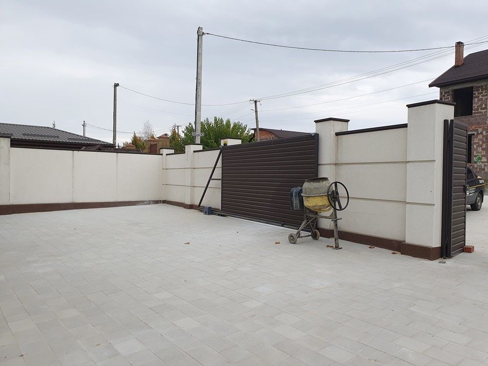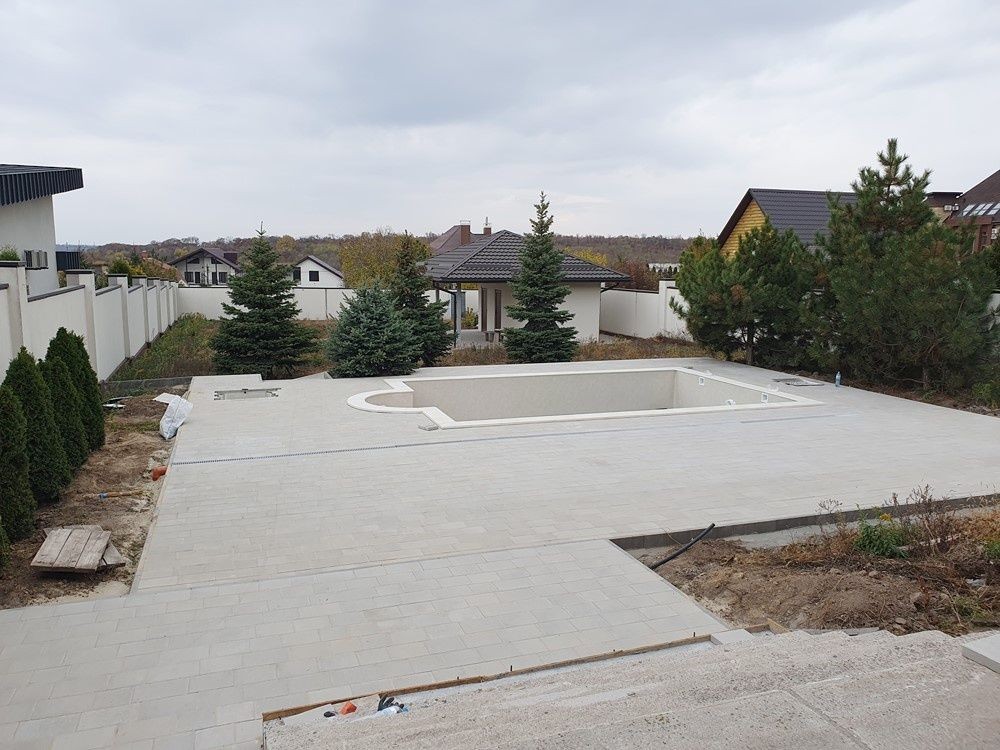 огорожен капитальным забором, бассейн (бетонная чаша), отдельно стоящий домик для отдыха с санузлом, туи по периметру, ели на территории, тротуарная плитка,