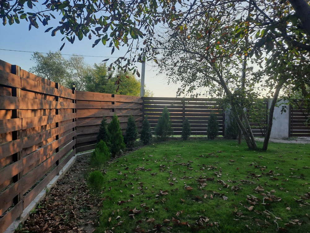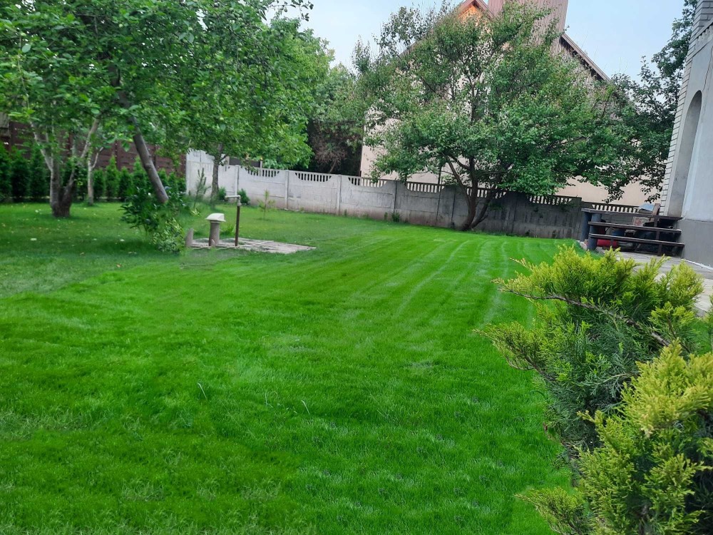 На участке высажены туи,сосны,газон