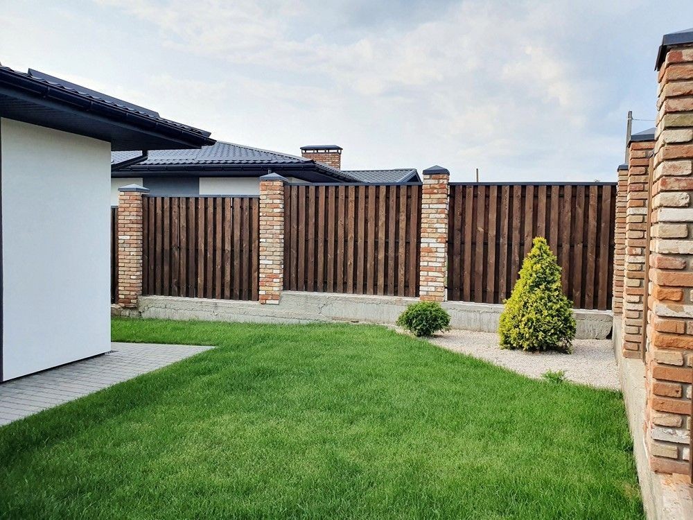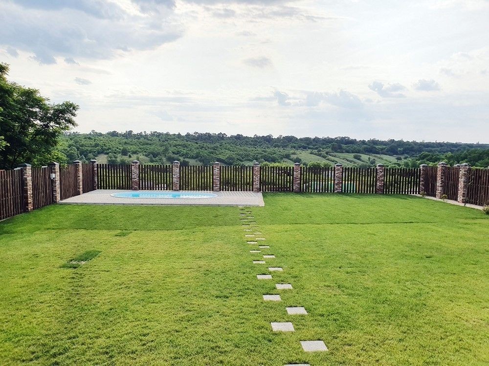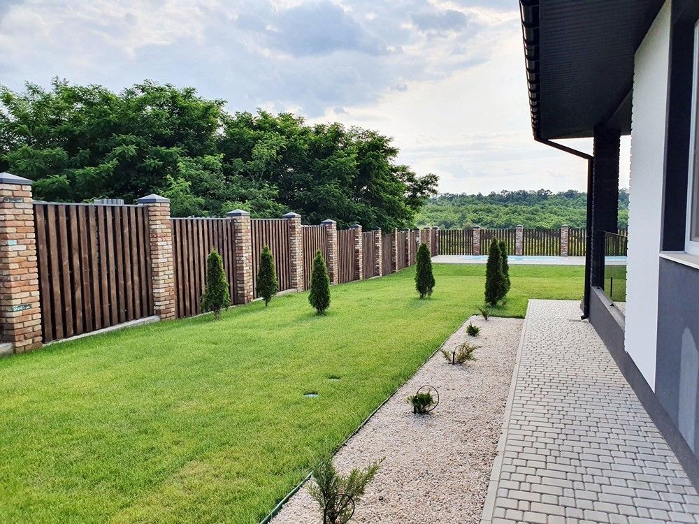 Огорожен капитальным забором, газон с авто поливом, тротуарная плитка, молодое озеленение, бассейн, парковка на две машины, автоматические ворота.