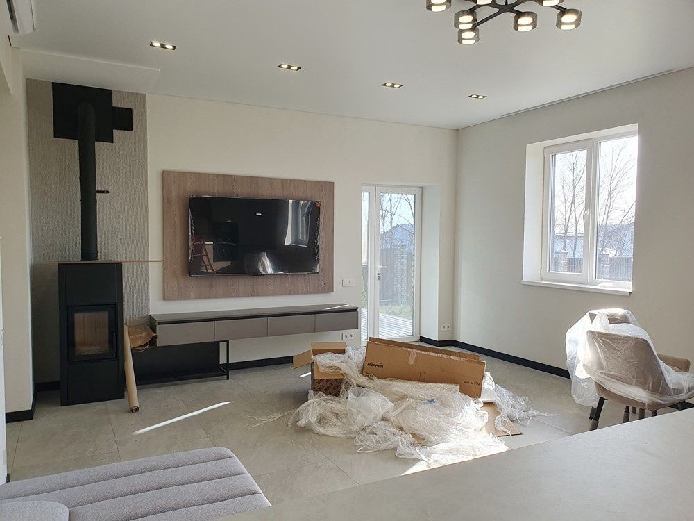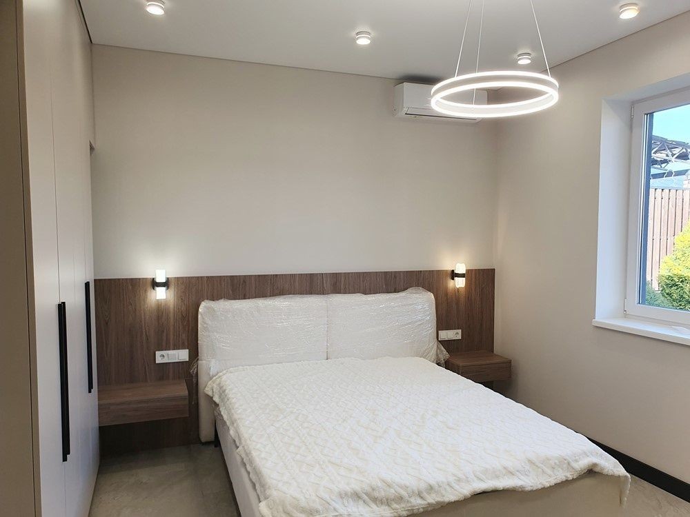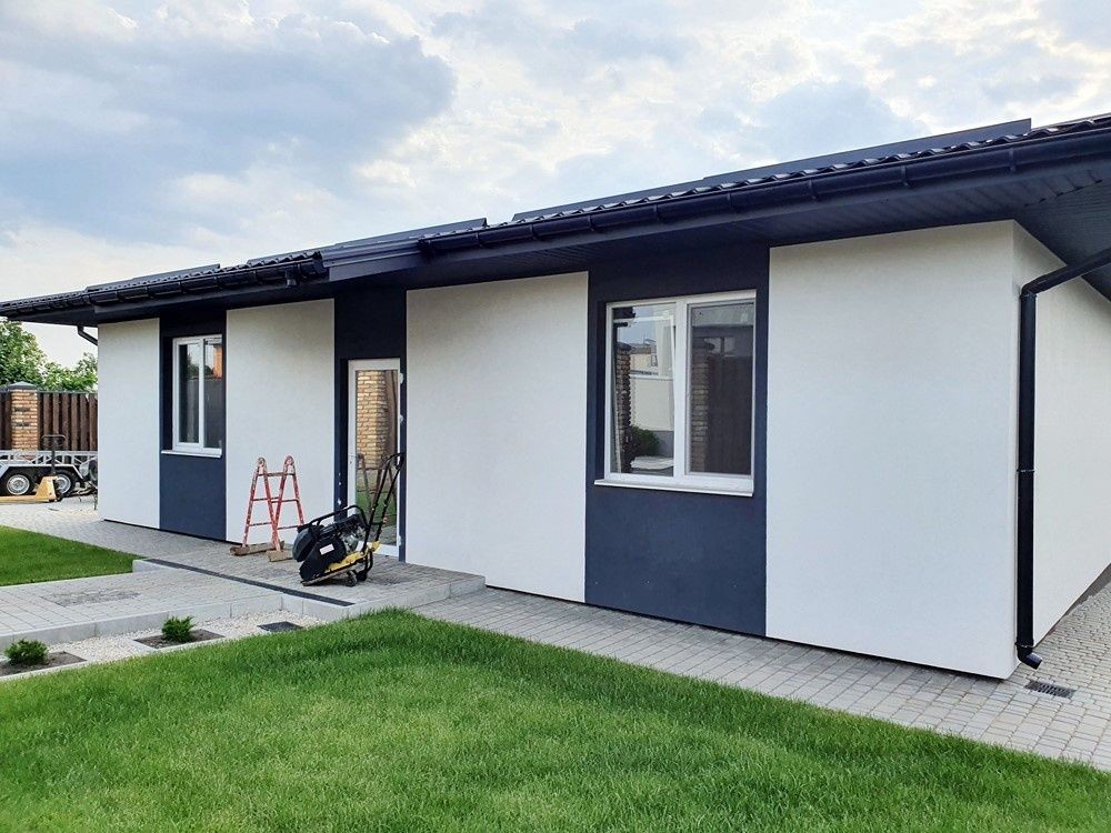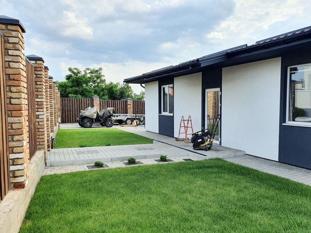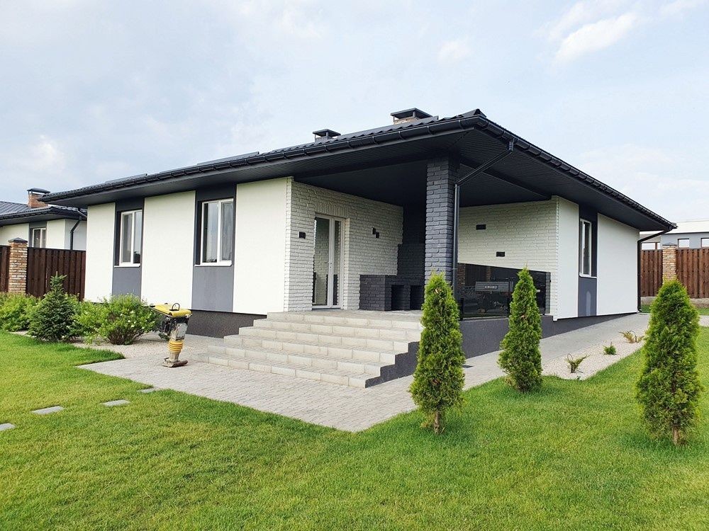 132м.кв. 1-но этажный, стены газобетон + утеплен, металлопластиковые окна, крыша метало черепица, вода городская, солнечные панели, тепловой насос, стационарный инвертер, интернет, кондиционеры. Внутри заканчивают новый свежий современный ремонт с полной комплектацией мебелью и бытовой техникой. Осталось по мелочам, повесить шторы, и сделать уборку. Планировка: кухня – студия с выходом на террасу которая смотрит на задний двор с бассейном и шикарным видом на посадку, 3 спальни, два санузла, коридор, топочная.