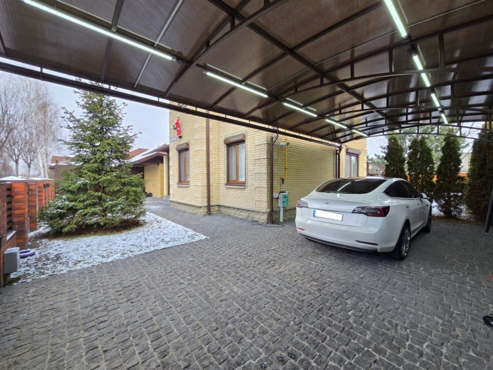 Дом оснащён всем необходимым: мощная электросеть (15 кВт), зарядная станция для авто, навес на два автомобиля, отапливаемый вольер для собак, генератор и инвертор. Отдельный блок для хранения инвентаря и техники.