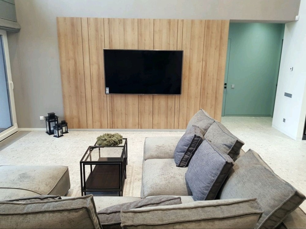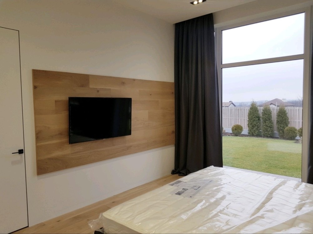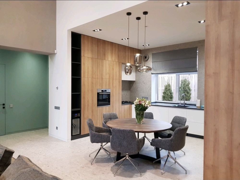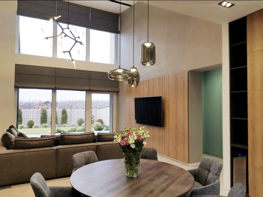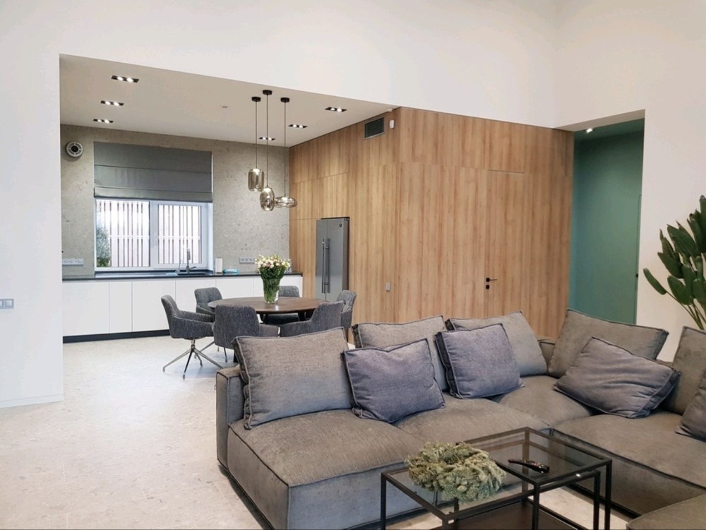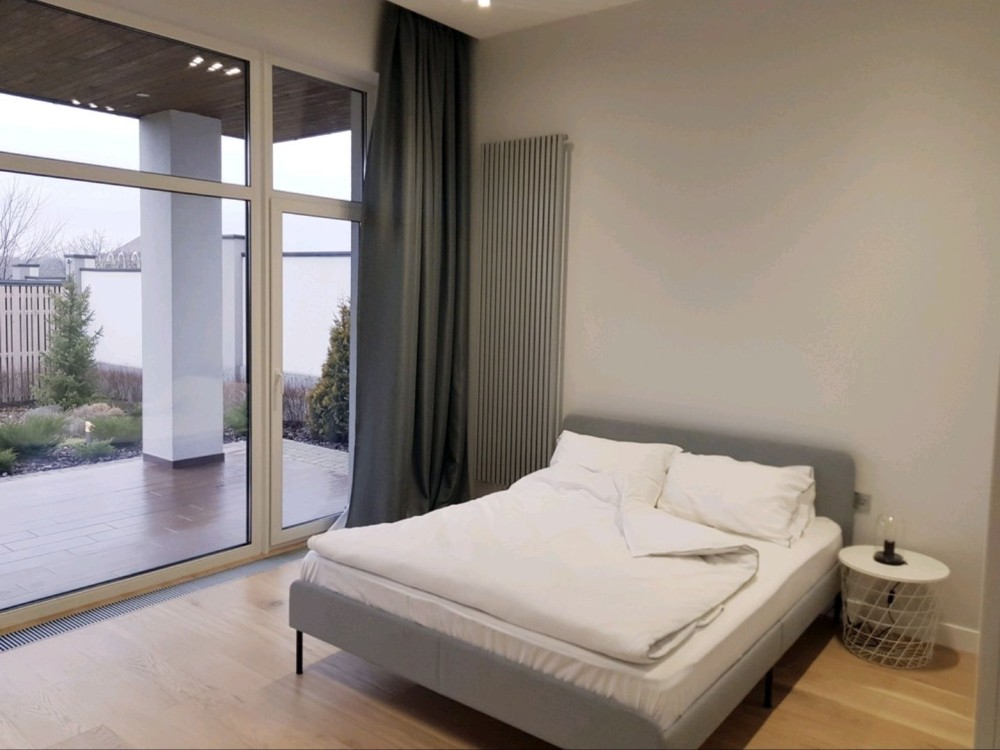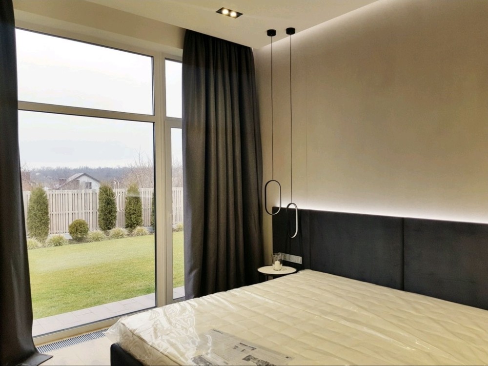 181м.кв. 1-но этажный + терраса 30м.кв. стены газобетон, современный стиль, дорогие материалы, качественные работы. Внутри дома выполнен красивый и модный ремонт под ключ с мебелью и техникой. Планировка: гостиная – студия с панорамными окнами и двойным светом, 4 комнаты, 3 санузла, топочная, гардеробная.