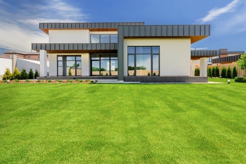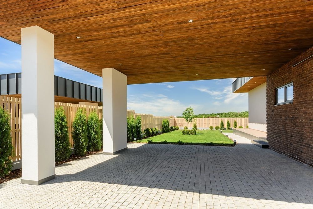 огорожен забором, ландшафтный дизайн, газон с автоматическим поливом, навес на несколько автомобилей,