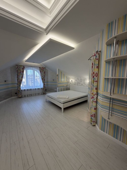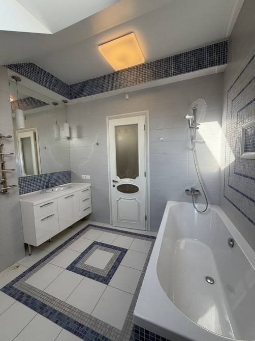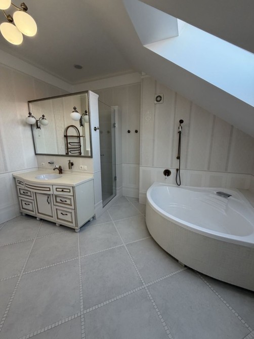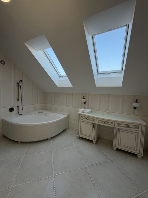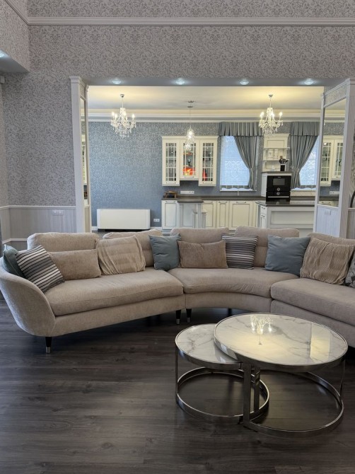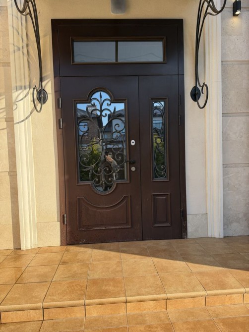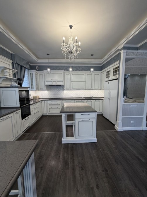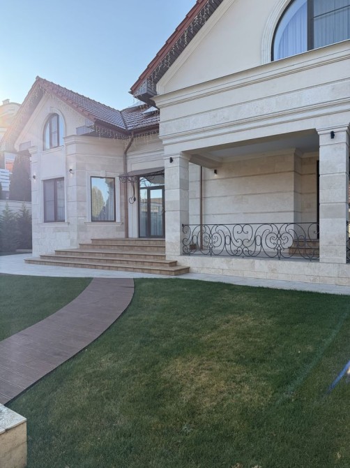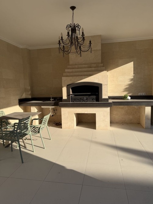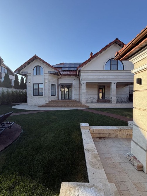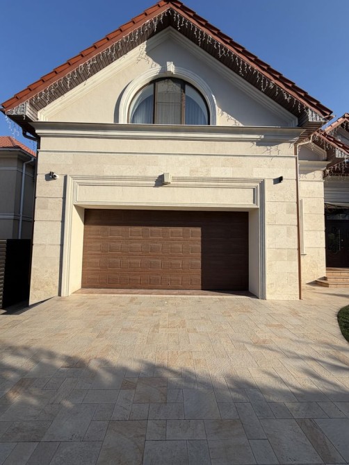Дом облицован травертином, натуральная черепица, алюминиевые окна с евробрусом. Мраморная лестница с подсветкой, камин из натурального мрамора. Качественная сантехника и бытовая техника европейских брендов, кухня с кварцевой столешницей.